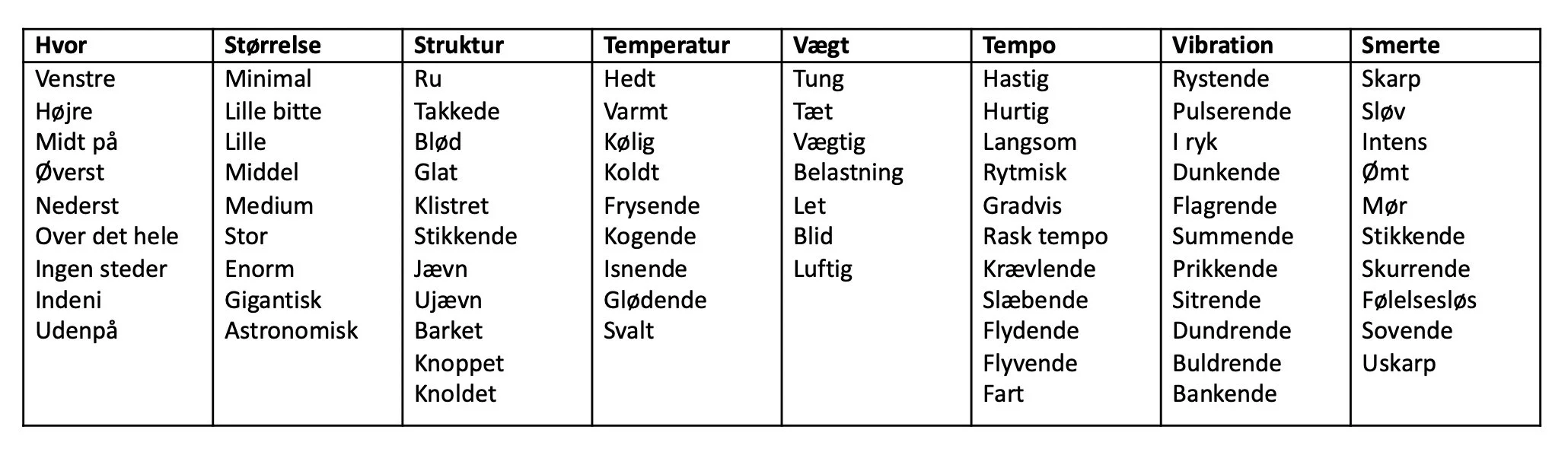 Ja ja, der er altid guld i form af viden at hente i bevidst bevægelse. Jeg har nedenfor indsat et skema over de lag i sanseligt sprog der ofte bruges i yogaverdenen*. Ordene er min oversættelse af et opslag på Instragram fra Somatic Experiencing® - en konto der er værd at følge for sanselige bevægelsesnørder – og det kan vi alle blive.